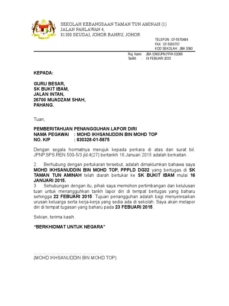 Perkara di atas adalah dirujuk. Contoh surat penangguhan lapor diri. Berdasarkan surat penempatan pertukaran dari jpn selangor .